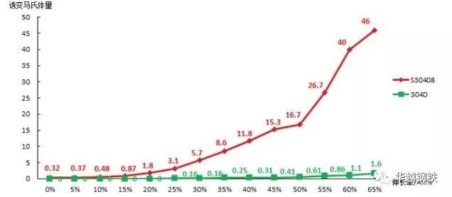 304D與S30408冷加工誘變馬氏體含量隨伸長(cháng)率增加而變化圖