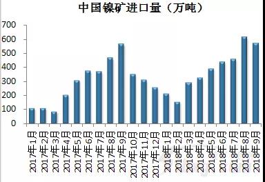10月進(jìn)口鎳礦607.97萬(wàn)噸,較9月增加42.66萬(wàn)噸,環(huán)比增幅7.55%;較去年同期增加257.94萬(wàn)噸,同比增幅73.69%。