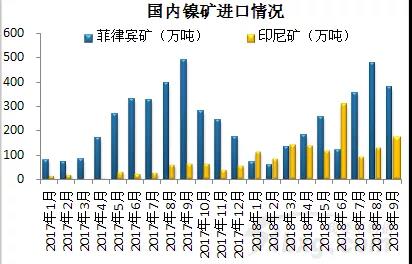1-9月,中國鎳礦進(jìn)口量約3461.5萬(wàn)噸,同比增加871.2萬(wàn)噸,增幅33.6%。其中從菲律賓進(jìn)口約2033.6萬(wàn)噸,同比減少180萬(wàn)噸,減幅8.1%;從印尼進(jìn)口約1281.5萬(wàn)噸,同比增加1054.8萬(wàn)噸,增幅465.3%。